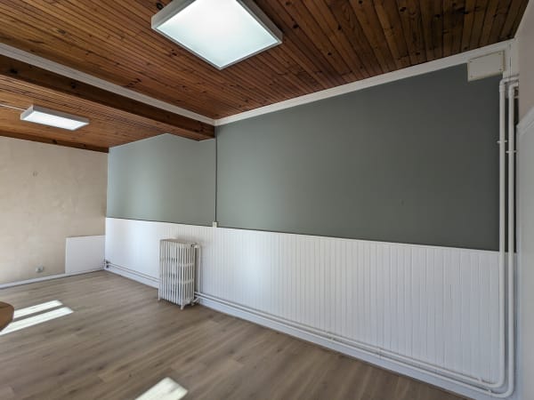 Après un rendez-vous, nous avons mis en avant le besoin de tonalité douce pour accueillir et reposer en même temps. De calmer le jeu des lambris. Un mur de chaux ferrée s'invite pour apporter un peu de texture et de reflets. Le sol apporte beaucoup de chaleur avec le bois.